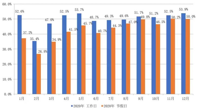 2020年私人小汽车平均出车率为47.5%,较上年大幅下降。受工作日上班、上学等活动影响,工作日出车率高于节假日出车率,其中工作日出车率为49.8%,节假日出车率为42.9%。分月份看,受天气和假期影响,冬季车辆工作日使用频率高于其他月份,12月工作日出车率最高,达53.9%;其次5月,为53.7%。受新冠肺炎疫情影响,居民多选择远程办公,出行需求大幅下降,第一季度工作日出车率降至低谷,其中2月最低,仅为35.4%。