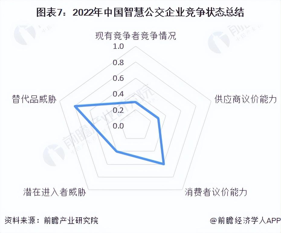 从五力竞争模型角度分析,智慧公交车企业通常是运营的角色,对于公共交通工具的使用有较强的议价能力,而上游的公共汽车提供方为了提高市场竞争力在议价能力上表现较弱。目前来看,除了公交汽车整体上没有太多进入者外,智慧公交的技术提供商以及运营商进入较多,整体进入者威胁较大,对传统公交企业进行一定的冲击。智慧公交作为智慧交通当中的细分领域,可替代的产品较多,其他智慧化的交通工具,例如轨道交通、出租车以及私家车等代步工具,且由于疫情原因公交车停运情况较为不确定。目前我国智慧公交五力竞争总结如下:
