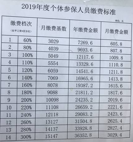 距离2019年年底还有几天时间,没有缴纳养老保险的个人还需尽快缴纳,缴费标准共分为14档,最低档年缴费7269.6元,最高档年缴费36352.8元。