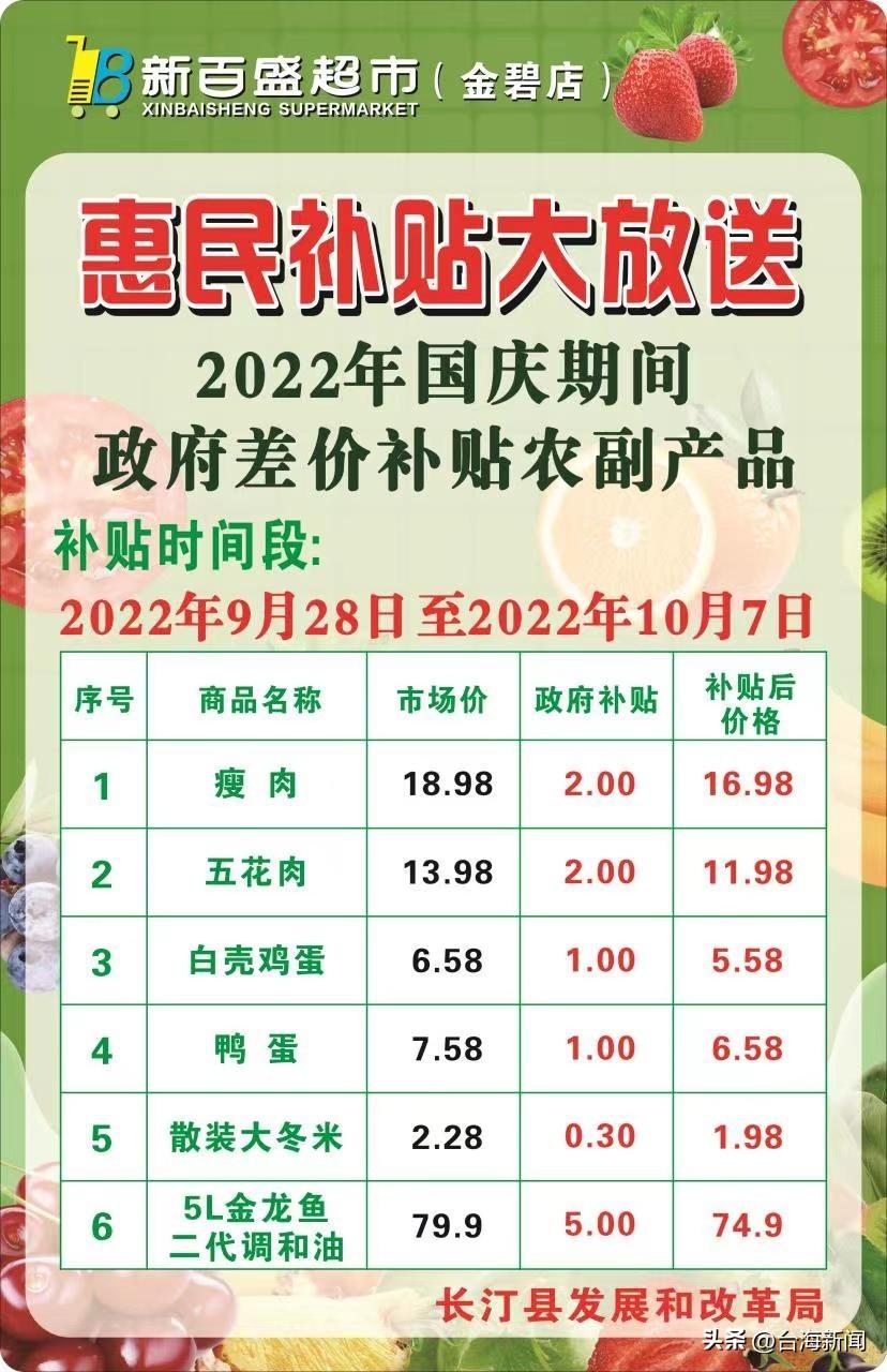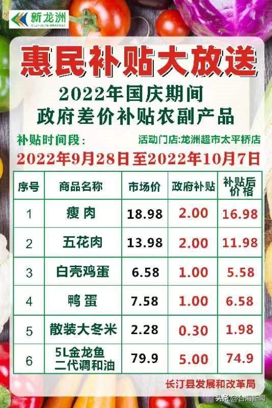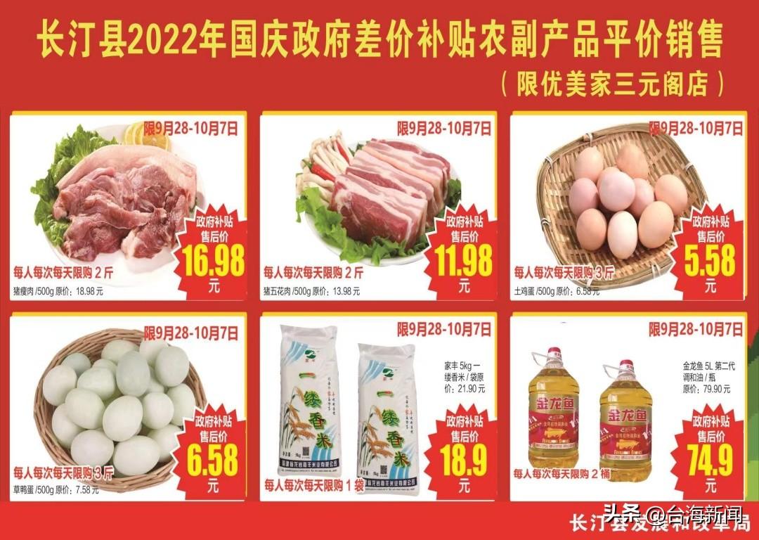 为切实做好国庆期间重要民生商品保供稳价工作,确保市场价格稳定,2022年9月28日起,长汀县城区启动2022年国庆期间政府差价补贴平价销售机制。