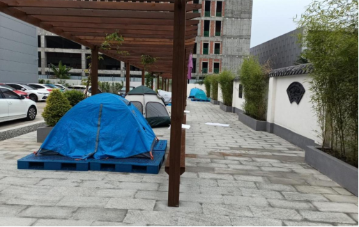 ↑封控期间,驻厂员工在生产园区内搭建临时帐篷区
