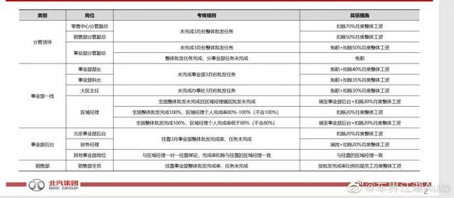 3月10日,一张北汽集团的3月份销量考核方案被发布在了微博上,内容显示:不达标的领导、员工将扣除相应月度工资或免职,最高扣除70%的月度整体工资。