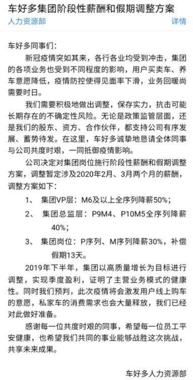 车好多:管理层最高降薪50%,普通员工降薪30%