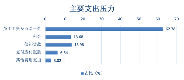 大环境不够乐观的基础上,企业的主要支出压力却依旧存在。在清华、北大联合调研了995家中小企业中,62.78%的企业主要支出压力为员工工资及五险一金,租金、偿还贷款等费用的占比远小于员工工资。