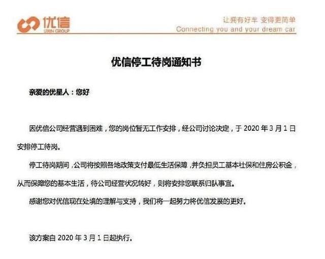 2月28日,优信公司发布了“优信停工待岗通知书”的内部邮件:从3月1日起,对部分员工进行降薪,降幅在20%-40%;部分员工3月1日起停工待岗,按各地政策支付员工最低生活保障。