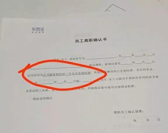 3月9日,一张车置宝“员工离职确认书”被上传在了网络上,确认书显示,员工的薪酬支付时间为公司融资到位后一个月内全部结清。