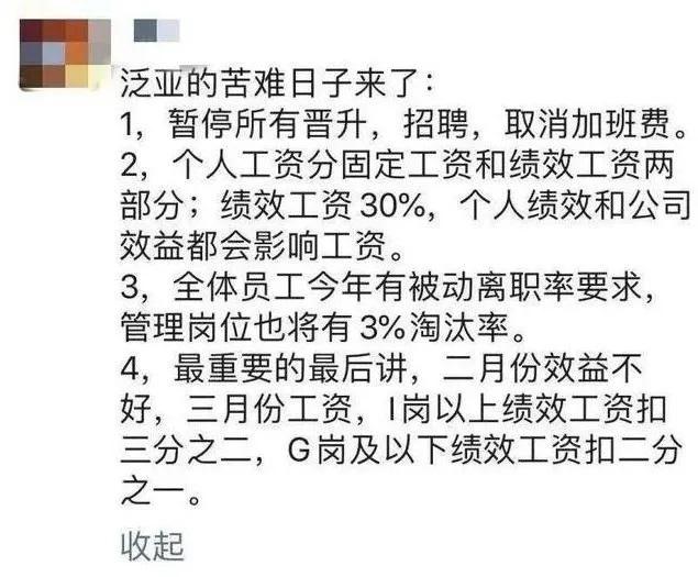 泛亚汽车:取消加班费,三月份工资I岗以上绩效工资扣2/3,G岗及以下绩效工资扣1/2。