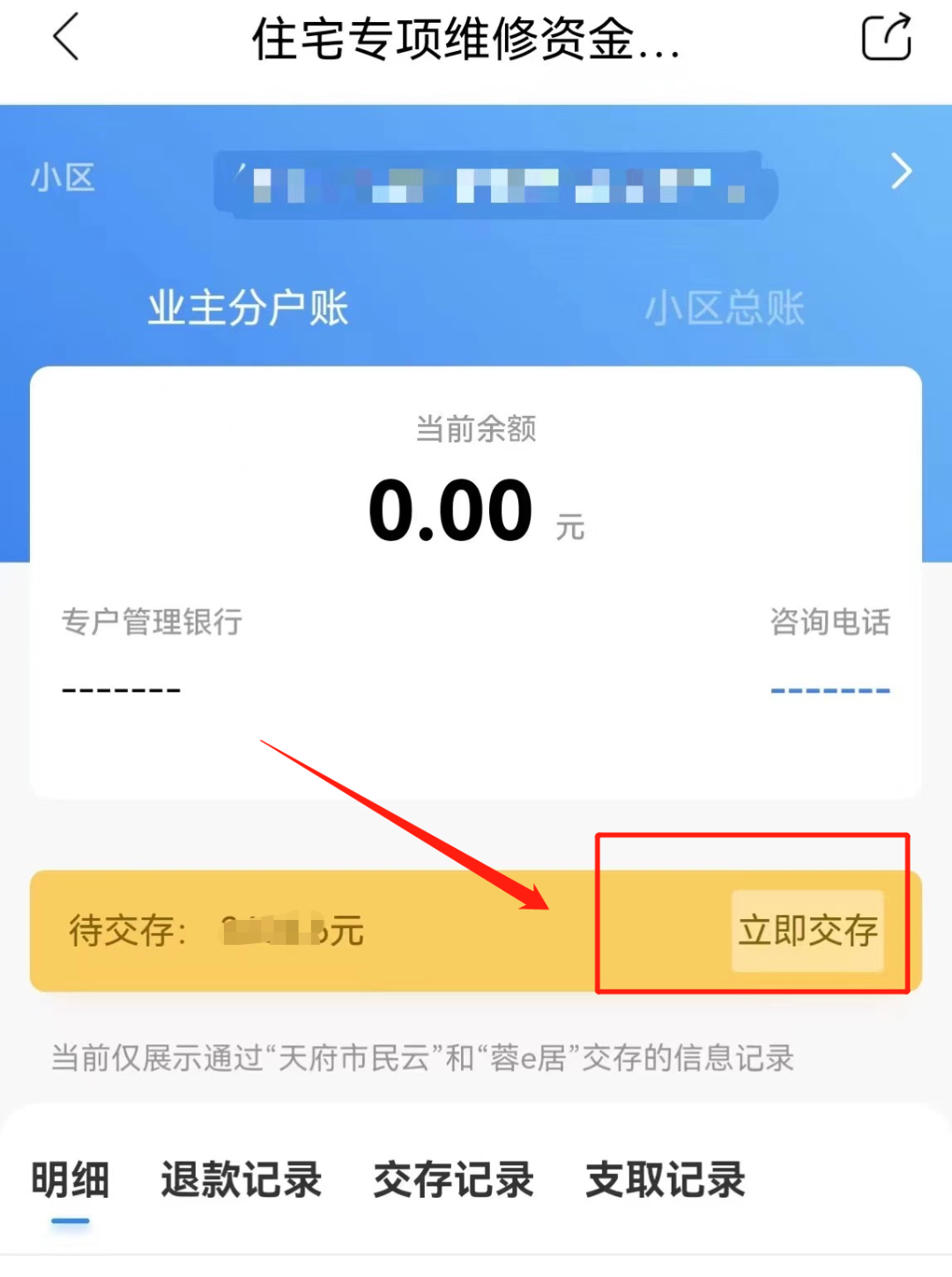 手机下载天府市民云APP—实名认证—点击“住在成都”—点击“我的小区”—点击“我是业主”—点击“住宅专项维修资金”—点击“交款”。