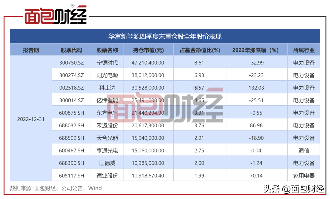 2022年第四季度,华富新能源前十大重仓股中新加入科士达、禾迈股份、德业股份。这3只股票2022年股价表现强势,均上涨超过70%。