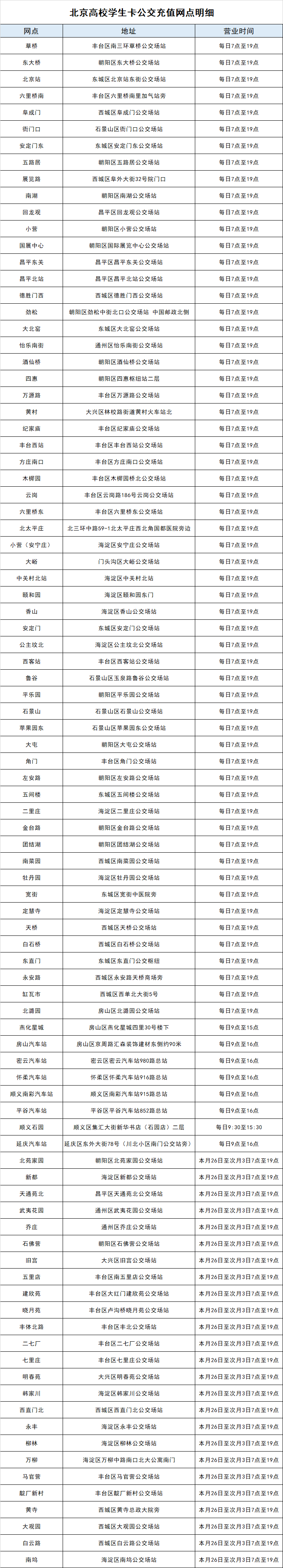 未配发新版高校学生卡的同学需前往北京公交集团线下人工窗口办理充值、延期业务,具体网点请参考下表。