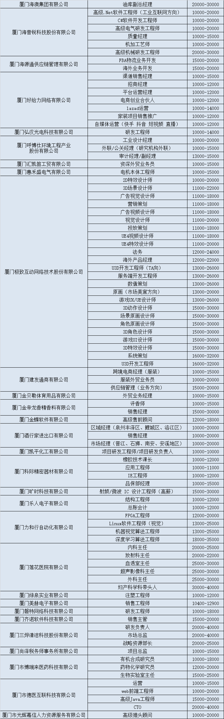 集美大学、厦门大学嘉庚学院、厦门建发通商有限公司、厦门象屿集团有限公司、厦门东声电子有限公司、安捷睿(厦门)机器人有限公司、厦门飞朔生物技术有限公司、厦门极致互动网络技术股份有限公司等众多用人单位向人才抛出橄榄枝。最低薪资万元起,年薪高达60万,此外还有丰厚提供的福利待遇,有意向的人才赶紧来参会!