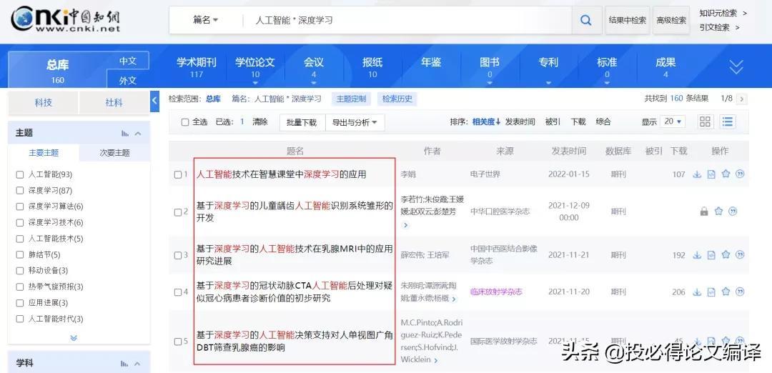 比如:篇名检索项后输入:人工智能 * 深度学习,可以检索到篇名包含“人工智能”及“深度学习”的文献。
