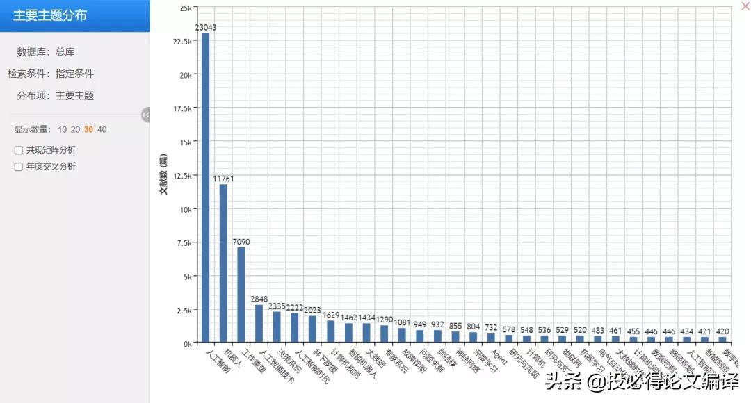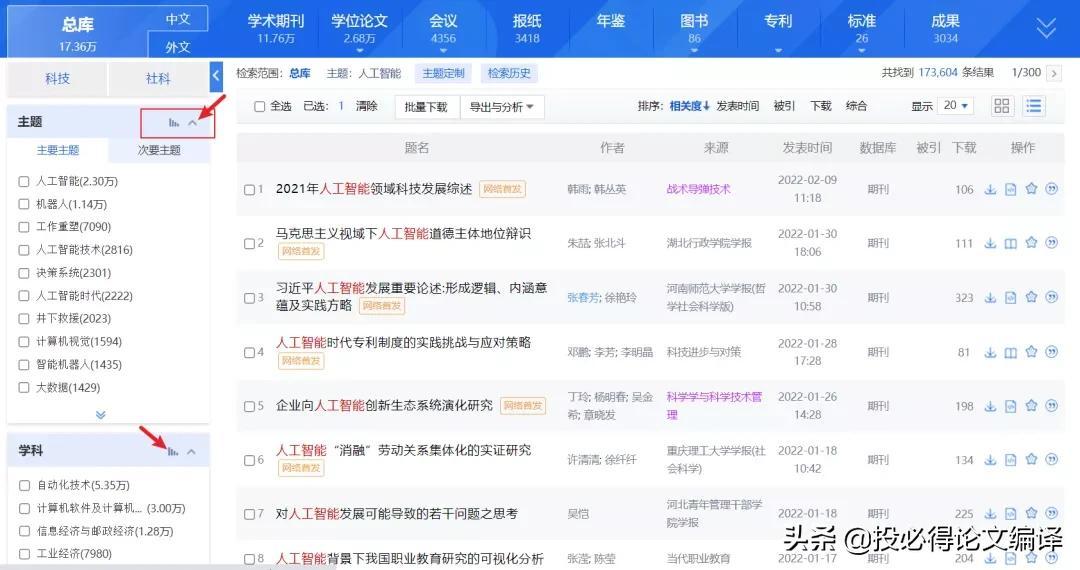 在检索框中以主题词进行检索,如我们以“人工智能”检索,在检索结果页面左侧的栏目中,可以看到每个分类的右上角都有一个可点击的可视化图标;