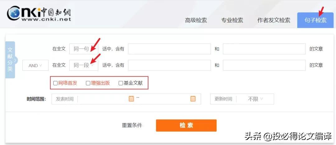 检索框下面还有一些选项可进行设置,比如网络首发、增强出版、基金文献、中英文扩展、同义词扩展,方便查全文献。在“