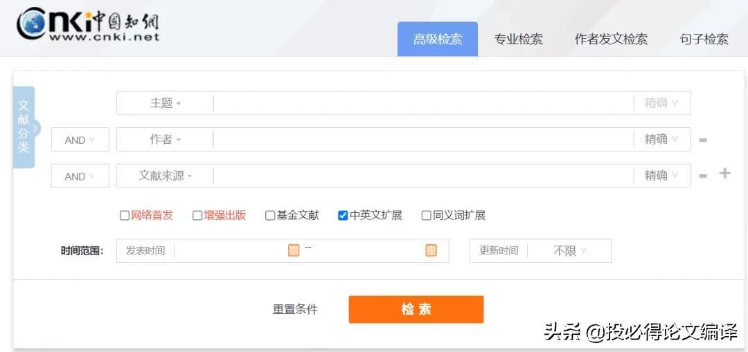 普通的一框式检索我们就不介绍了,这里介绍一下中国知网的高级检索。在知网首页点击检索框右侧的“
