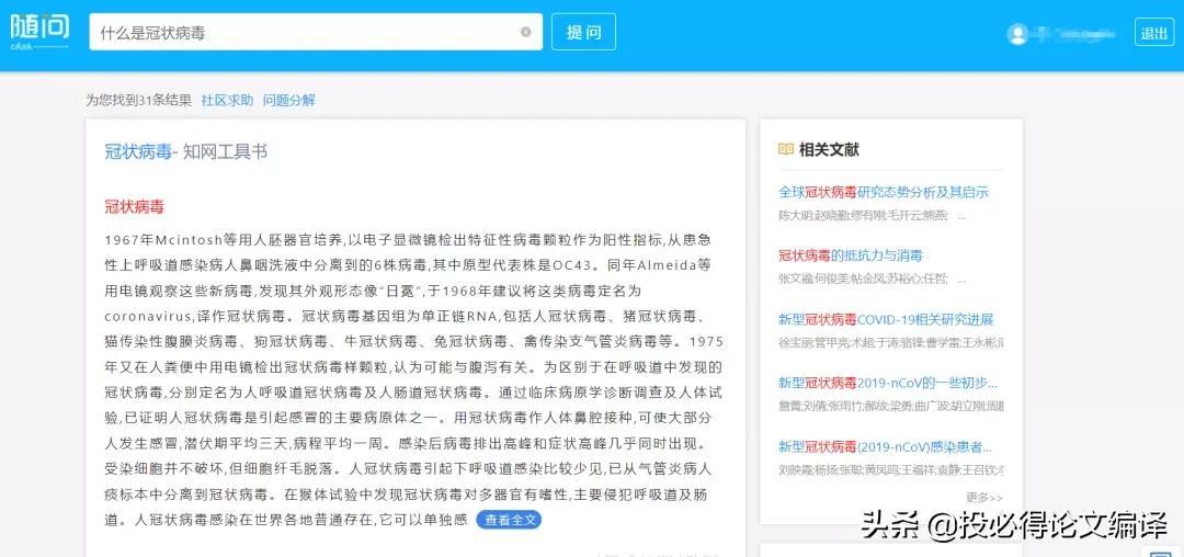 可使用自然语言或关键词进行提问,会自动从文献中挖掘答案。比如说我们提问:什么是冠状病毒?结果会给出冠状病毒的概念,并且给出相关的文献片段、来源等,这难道不比百度更加专业?