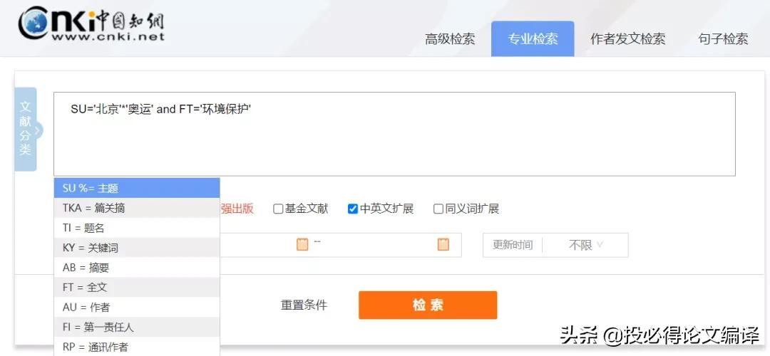 比如我们需要检索主题包括“北京”及“奥运”并且全文中包括“环境保护”的文献,可输入:SU='北京'*'奥运' and FT='环境保护'