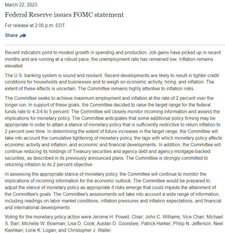 整体而言,此次的决议声明基本符合市场预期,在银行业危机爆发和美国通胀依然高企的背景下,美联储没有选择盲目加息50基点,也没有如一些市场人士预计的暂停加息,选择了中规中矩的做法。