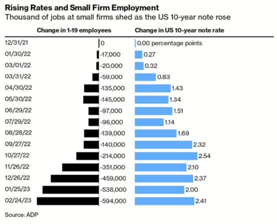 根据数据显示,在美联储加息的一年间,美国20人以下的企业已经流失了60万个工作,这显示中小企业对于利率的敏感程度更高。
