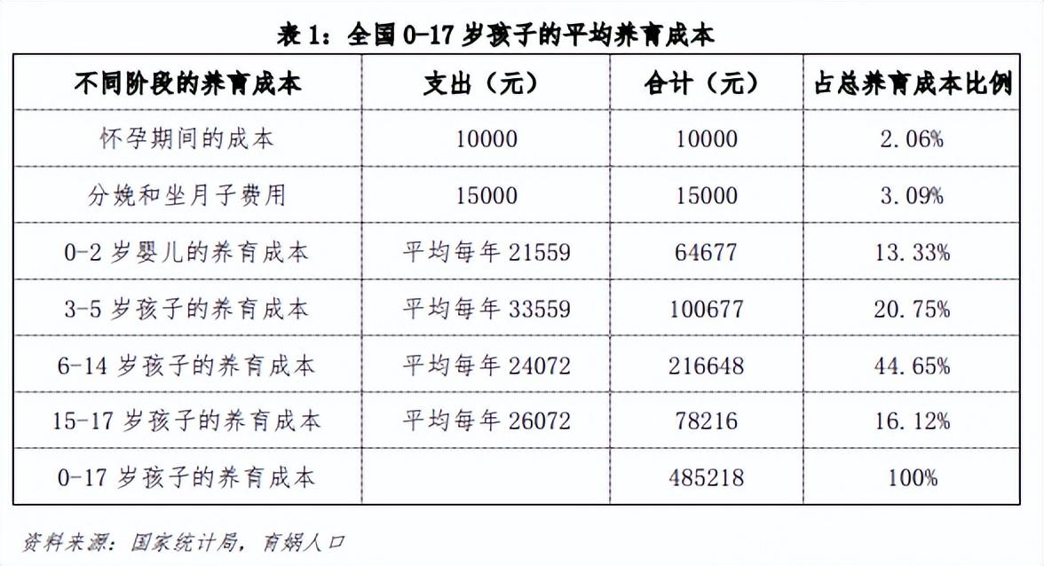 中国家庭养育一个孩子从0-17岁的平均成本为48.5万元,0岁至大学本科毕业的养育成本平均为62.7万元。