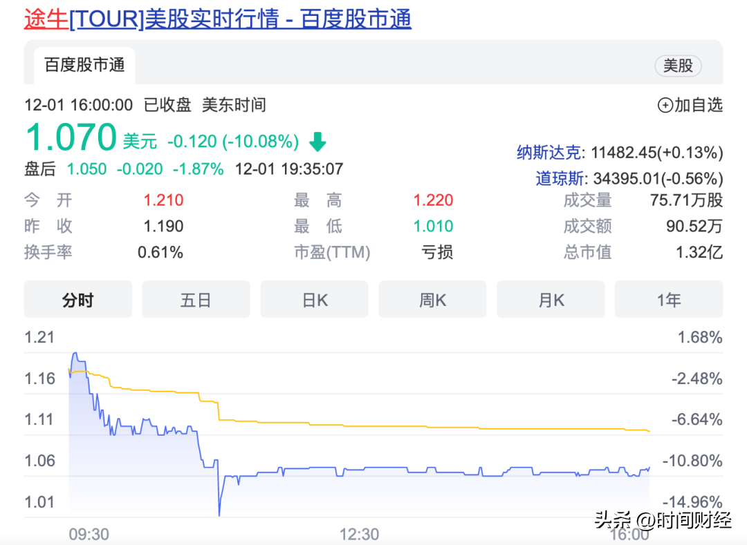 股价方面,截至美东时间12月1日收盘,途牛股价为1.07美元/股,跌幅为10.08%,总市值为1.32亿美元。