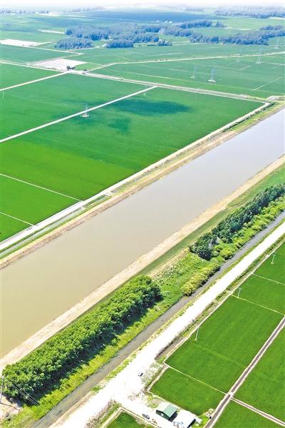 宋玉川的200亩水田方正平整,江水循环其间,顺着田边的渠道追溯源头,是西北方的黑龙江水经渠首泵站被“抬”进总干渠,再经二级、三级提水泵站流淌至此,行程近50公里。