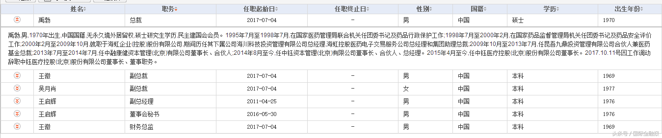 新董事长禹勃曾任昆吾九鼎投资管理有限公司合伙人兼医药基金总裁、中融康健资本管理(北京)有限公司董事长、中钰资本管理(北京)有限公司董事长、中钰医疗控股(北京)股份有限公司董事长。除他以外,中钰资本核心管理团队成员马贤明、王徽等亦为金字火腿董事会成员。
