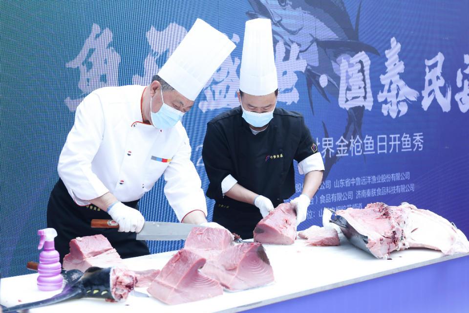 5月2日正值“世界金枪鱼日”。签约活动结束后,双方代表共同鸣锣抚刀,开启金枪鱼主题“开鱼秀”。现场华丽亮相的是一条重达160斤的蓝鳍金枪鱼,被称为“金枪鱼中的皇族”,属于非常稀有的顶级食材。资深开鱼师的熟稔操作,为大家呈现出难得一见的制作流程。