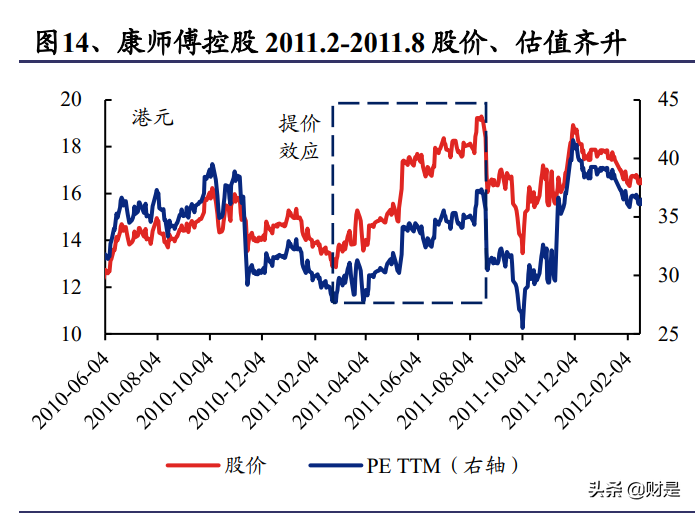 从资本市场表现来看,提价后市场形成公司基本面改善预期,股价和估值齐升。 康师傅股价受提价直接利好,2011 年 2 月至 8 月公司股价(按收盘价,下同)累 计最大涨幅 50.1%,PE(TTM)相应地从 27.7 倍提升至 37.4 倍;此后因基本面 改善情况不及统一,股价呈震荡行情。彼时统一的业绩基本面受到提价和老坛酸 菜面爆款产品的双重利好,2011 年 2 月至 2012 年 11 月股价整体上行,累计最大 涨幅达 167.2%(其中 2011 年 2 月至 8 月股价最大涨幅 32.7%);期内 PE(TTM) 从 20.8 倍一度升至 70 倍以上,后因利润兑现、EPS 上扬,估值被动回落,但仍 在 35 倍以上。复盘康师傅 2009 年至今的股价,发现其相对于大盘的超额收益主 要由实际业绩兑现驱动,方便面提价的利好预期则在短期内快速拉升股价。