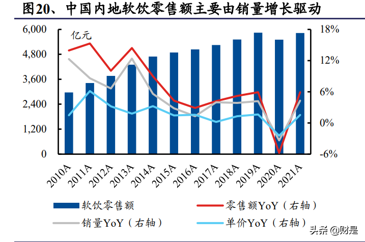 软饮行业整体:销量驱动软饮销售额增长。据 Euromonitor,2021 年中国内地软 饮零售额 5,829 亿元,2016-2021 年零售额、销量、单价的 CAGR 各为 3.0%、 2.5%、0.4%,销量增长为主要驱动力。2020 年中国内地人均软饮消费量为 60.4 升/人,约为中国香港和中国台湾的一半,仅为美国的 17.5%;2021 年内地软饮 零售单价为 1.0 美元/升,为发达经济体的 40%-80%。我们认为,未来国内软饮 行业扩容主要由销量增长驱动,单价提升有部分拉动作用。