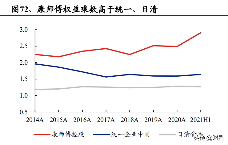 高分红+高 ROE 推高股息率。康师傅和统一股息率明显高于日清,系因 2018- 2020 年两家公司分红率达 100%,此外 2021H1 康师傅宣布派发中期特别股息 6.88 美仙/股,当期分红率超 100%;康师傅股息率高于统一则是由于 ROE 更高。 2021H1,康师傅、统一、日清食品的年化 ROE 各为 20.2%、12.6%、8.8%;同 期,三家公司的年化 ROA 各为 6.4%、7.8%、6.6%,权益乘数各为 2.90、1.64、 1.27 倍;权益乘数是推高康师傅 ROE 的主因,系因公司强大的渠道周转能力。