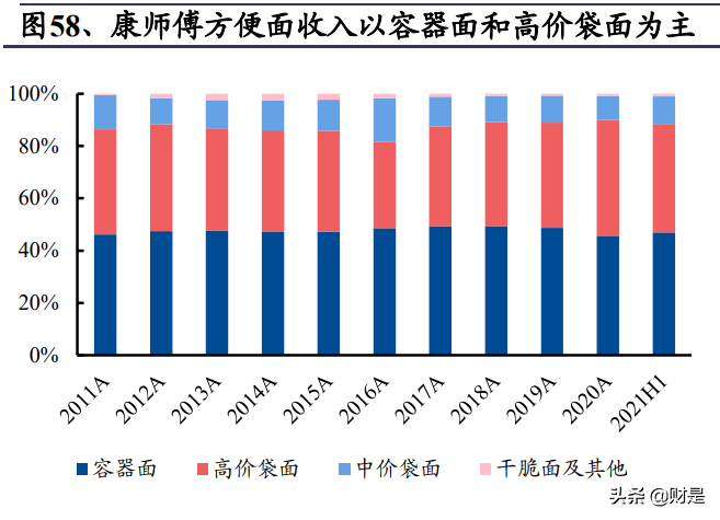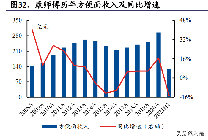 3)、2017 年后行业处于产品结构升级阶段。据世界方便面协会和尼尔森数据, 2019 年国内方便面销量较 2016 年年复合增长 2.5%;因疫情初期居家办公消费场 景带来的短期需求上扬,2020 年方便面销量同比增长 11.8%;因上年高基数, 2021H1 销量同比回落 7.7%。2017 年以来方便面行业整体回暖,原因一是部分消 费需求从中低价袋面向普通高价袋面及容器面转移。二是在高价面内部高端及 超高端产品发力。康师傅力推 4 元以上价格带(按当前每桶/碗/杯/盒的实际售价 计,下同)的汤大师系列,5 元左右价格带的熬制高汤、乾面荟、干拌面系列, 20 元以上价格带的“速达面馆”碗面等。统一力推 5 元以上价格带“汤达人” 系列、10 元价格带“冠军榜兰州牛肉面”系列、20 元左右价格带“满汉大餐” 系列等;高端及超高端产品销售额增速高于公司整体方便面增速。三是外卖的性 价比和替代效应下降。2018 年后外卖行业用户规模增速明显下降。目前外卖行 业竞争格局较稳定,补贴大幅减少,20 元以上外卖常态化,5-20 元的高端、超 高端方便面优势显现。