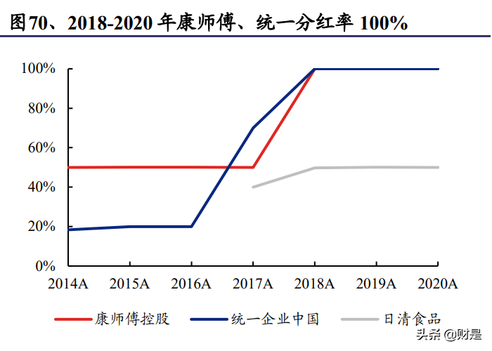 股息率稳定在 5%以上。我们以公司各财年宣派的每股股息为分子,以财报日收 盘价为分母,计算食饮公司各财年股息率。康师傅、统一、日清食品 2018-2020 年的股息率均值各为 5.4%、4.7%、2.2%。从近期股息率来看,截至 2022 年 3 月 10 日收盘,三家公司的股息率 TTM 各为 9.5%、6.7%、2.8%。