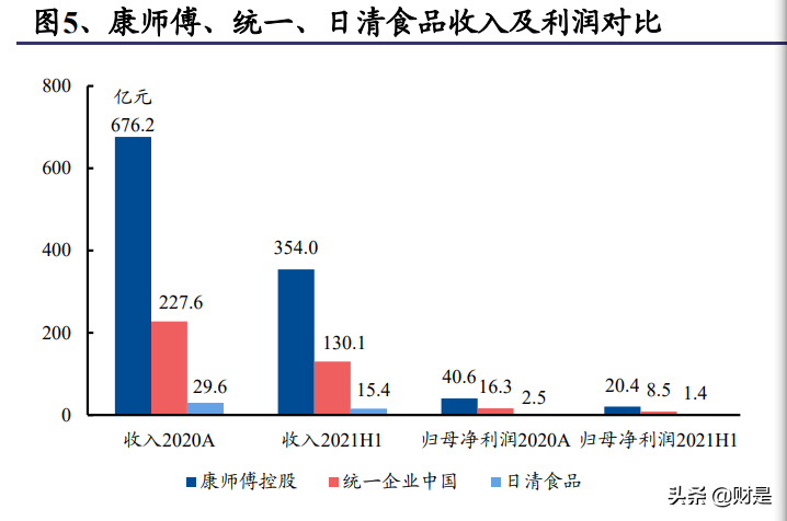 国内方便面行业呈现一超(康师傅)多强(统一、今麦郎、日清等)的稳定竞争 格局,其中康师傅、统一、日清为港股上市公司。康师傅和统一均以方便面和饮 品双轮驱动,前者方便面收入是后者的三倍;港股上市的日清食品主要在中国香 港和内地经营方便面业务,收入不足康师傅的 5%。