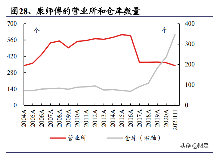 1)、从总量来看,康师傅有全国大众食饮行业中最强大的渠道网络。目前公司 80%销售额由经销商渠道贡献,20%由现代通路(含线上渠道)贡献。销售渠道遍布全国,在大多数核心城市完成直营二阶覆盖(只有一层经销商),目前覆盖 超 300 个城市的核心市区;在大中城市郊区、低线城市和下沉市场与优质经销商 合作,渠道深入乡镇。截至 2021H1 末,公司共有 341 个营业所(办事处)、346 个仓库以服务 79,051 家经销商及 227,501 家直营零售商。截至 2020 年末,康师 傅终端零售网点逾 400 万个,同期娃哈哈、达利为 300 万级别,旺旺、农夫山泉、 统一为 200 万级别,怡宝、东鹏等多数品牌则在 200 万以下。宽广的渠道带来规 模效应,摊薄销售及管理费用率,康师傅的销管费用率长期低于统一。