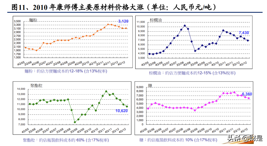 背景:原材料涨价使毛利率承压。2009 年至 2011 年上半年,面粉、棕榈油、聚 酯粒、糖等主要原料成本大涨。在成本上涨初期,康师傅和统一通过提高生产效 率、调整产品结构、扩大规模效应来抵消成本压力,2009 年毛利率有一定提升; 2010 年上游成本继续加大,两家公司毛利率分别同比-6.2、-7.6pcts。